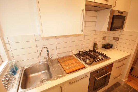 We have used modern white gloss Ikea kitchen units with Black granite worktops and "underground" looking black tiles to give a bit of metropolitan look to this purpose build flat. The main doors was blocked of and main opening moved to the side to accommodate new patio doors which now are in used as main doors.